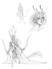 Predictably, Líorri was the trickiest character to design and by far took the longest. I went through multiple pages of ideation before landing on the final shape design. Originally my references leaned mostly on traditional Celtic clothing, but i ended up broadening them to include Romani, Gafsa, and Lakota clothing. I had a lot of fun with the colors, and while I had originally intended to have them as dark haired with very pale eyes, I found that the inverse ended up being the color pallete that I was most drawn to.